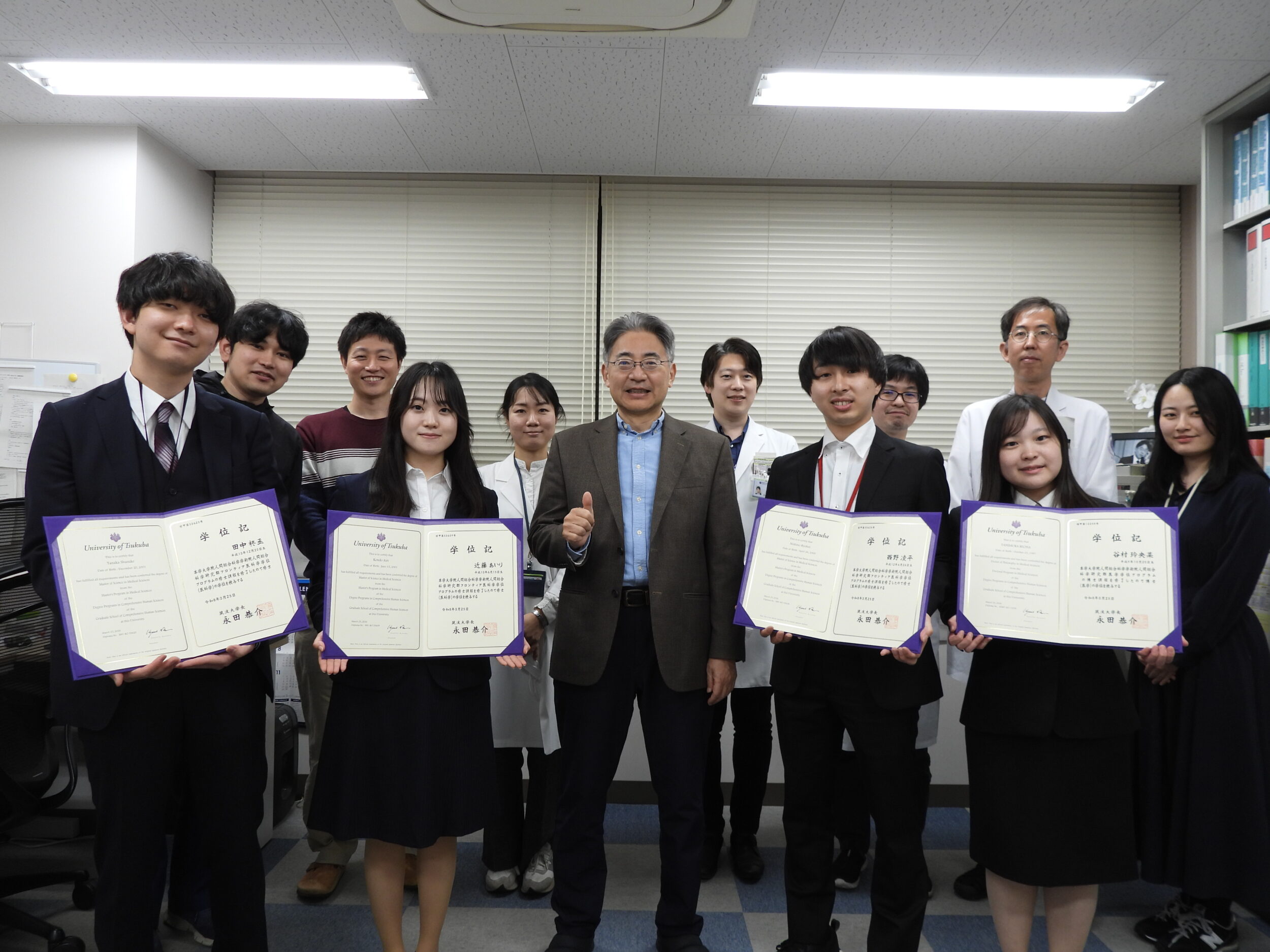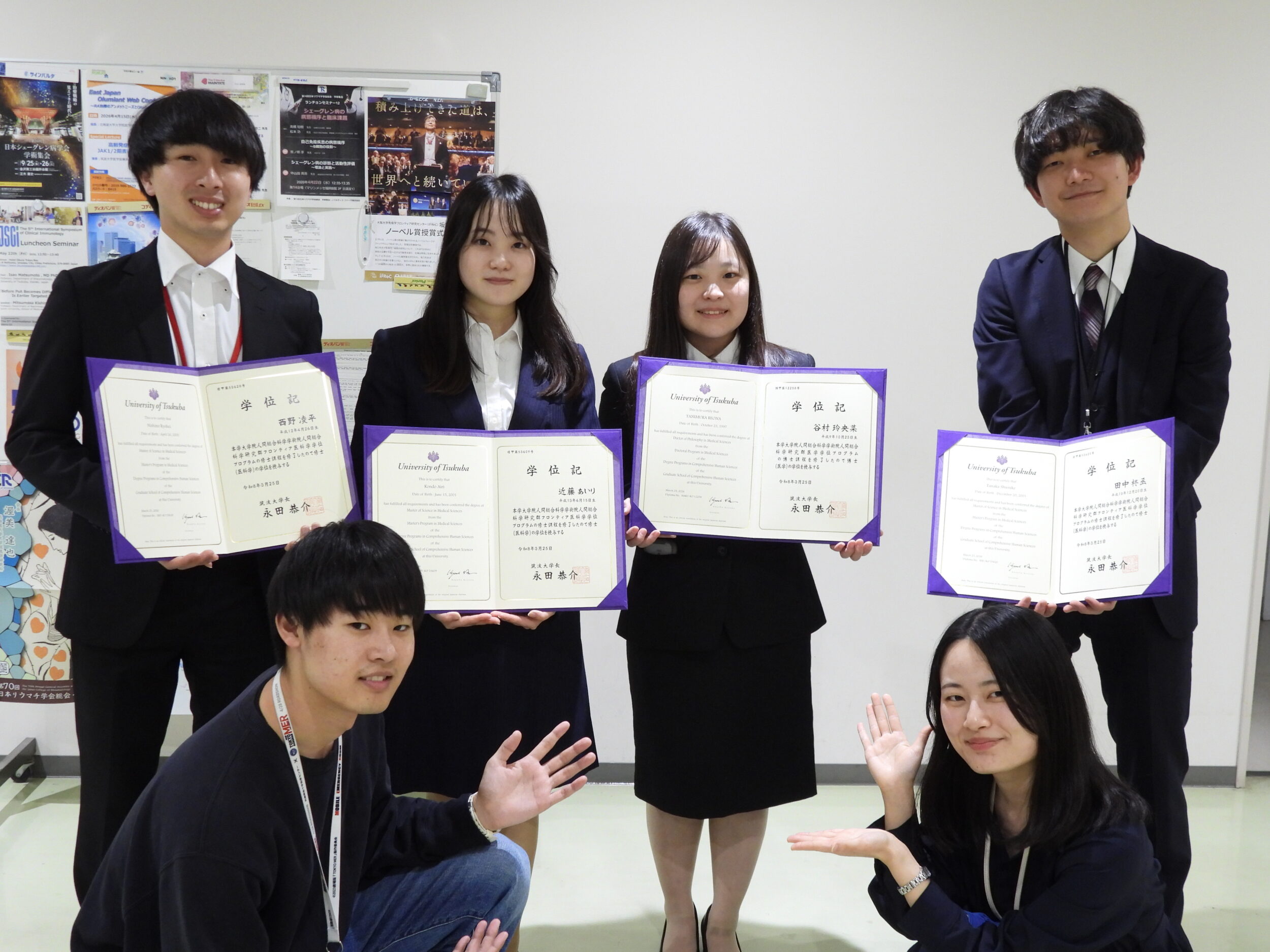 谷村さんが博士、近藤さん・田中さん・西野さんが修士の学位が授与されました。